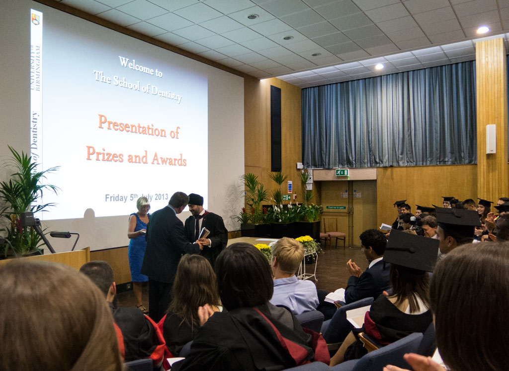 In the afternoon people gathered for Prize giving at the Dental School. Our guest of honour was the Chief Dental Officer, Barry Cockcroft. There was loud applause as the prize winners were announced to staff, parents and friends in the audience. Barry Cockcroft then gave the address and provided memories of his time as a student at Birmingham. After the ceremony it was fizz and cup cakes in the canteen. Everyone left very happy and content in the knowledge that the celebrations were still not over as we look forward to the Graduation Ball.