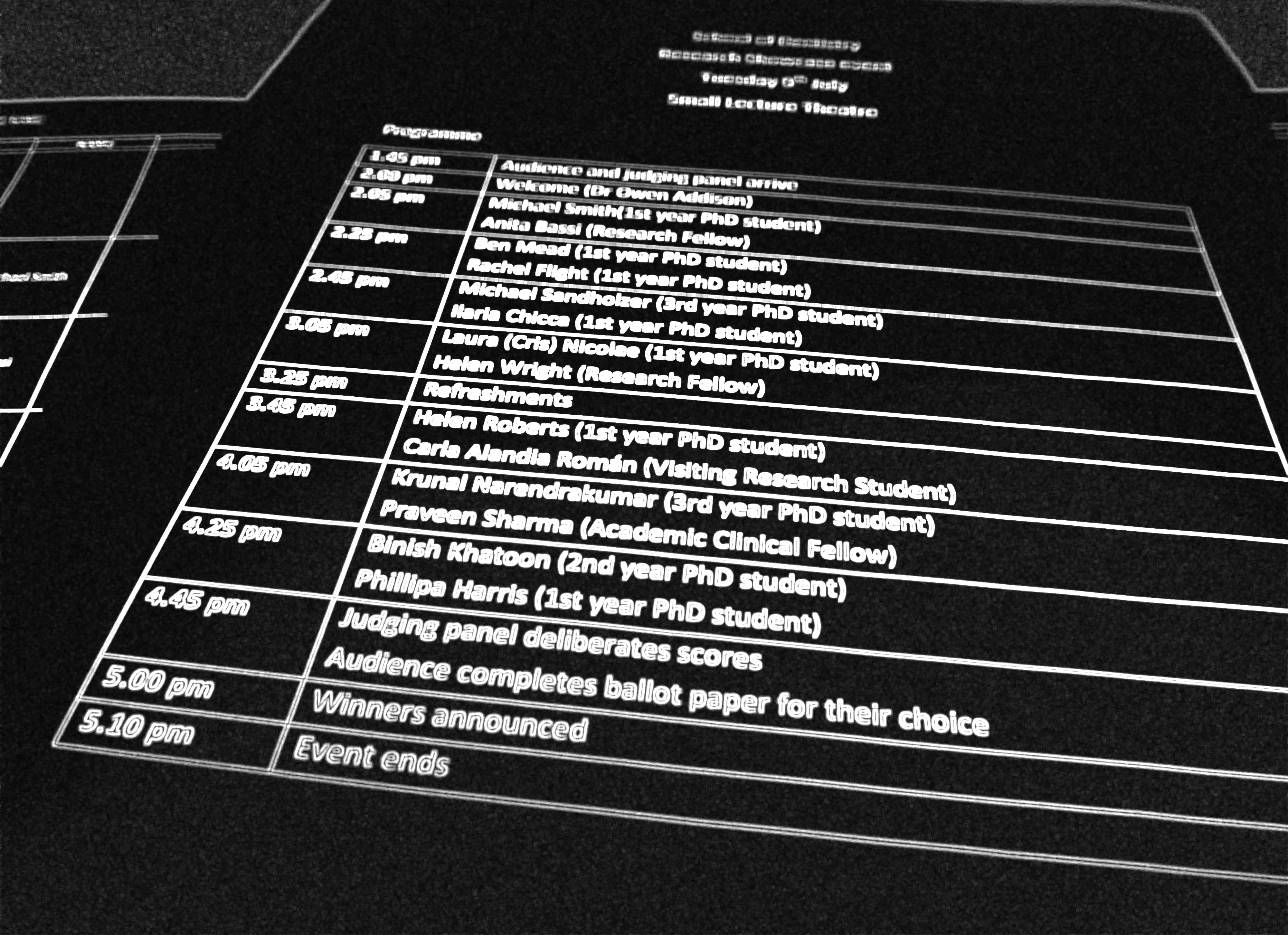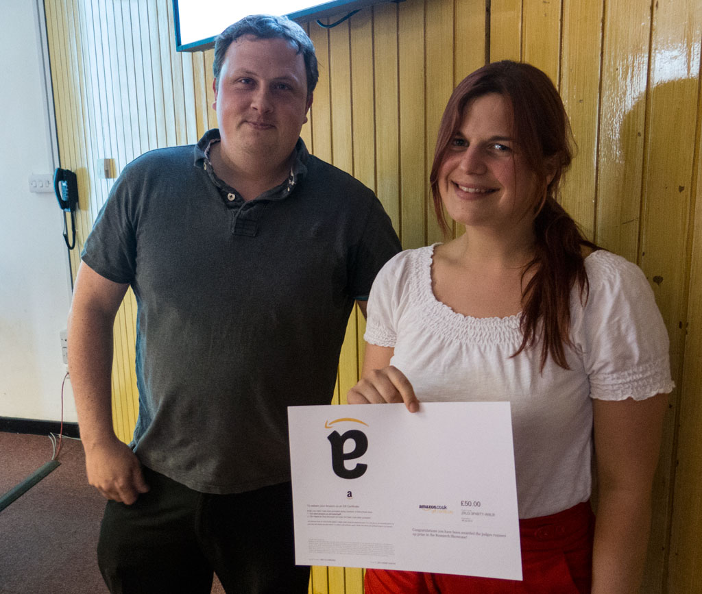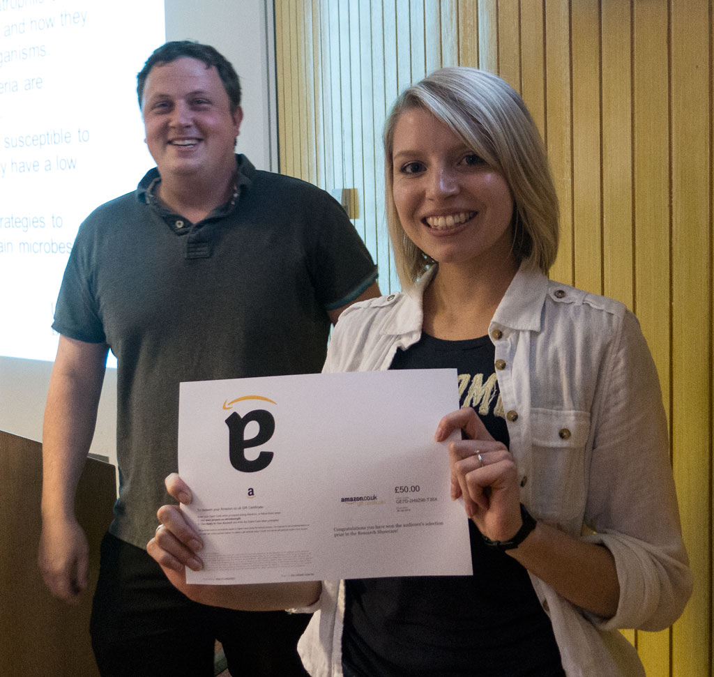 Sarah Knaggs our research administrator and Owen Addison, Senior Lecturer, introduced the Karaoke afternoon to the assembled audience of doctoral students and supervisors. There were 7 pairs of doctoral students and each were given the task of not only presenting their own research but describing the impact and significance of their partner’s work. The incentives for the afternoon were Amazon gift tokens for the lucky winners. The judges were Michelle Holder, Professor Walmsley and Dr Owen Addison. There were four prizes which included the Judges best presentation and two runners up. There was also a prize for the audience’s choice. Pictures of the day and the winners are shown below.