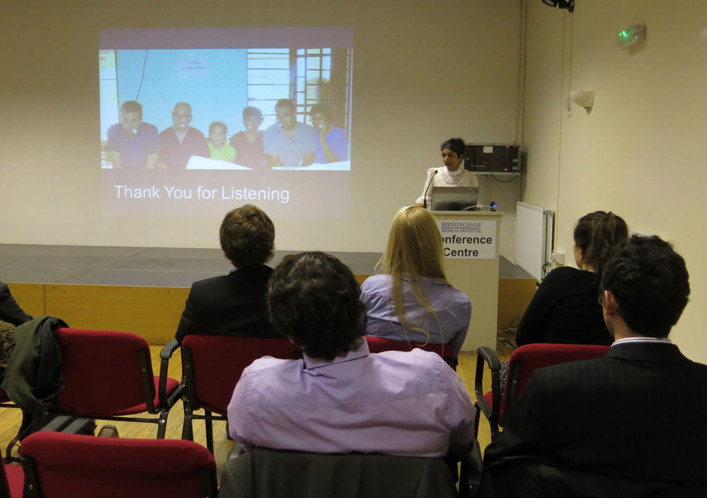 The 32nd Annual Meeting of the Sands Cox Society took place at Birmingham Medical Institute and it is a showcase for Birmingham Dental and Medical Students to showcase their work. Krishna Patel, was the recipient of the John Rippin Dental Elective Bursary. Krishna who is a final year dental student presented her work which was entitled “To explore and compare paediatric dental health intervention in a rural and urban part of Da Nang, Vietnam”. In her presentation she provided a background to the regeneration of post war Vietnam and her experience of providing dental care in one of the outreach clinics around Da Nang. Yatisha Patel won the Sands Cox Society John Rippin Best Elective Report and as part of the prize is invited to present at the Annual Meeting. Yatisha’s presentation was “Evidence based self care strategies for dental pain and preventative oral health care advice via smartphone technology.” Yatisha is now a dental foundation dentist and has enjoyed much success with her innovative work. Both Krishna and Yatisha gave excellent presentations to the Society and the school congratulates them on their performance.