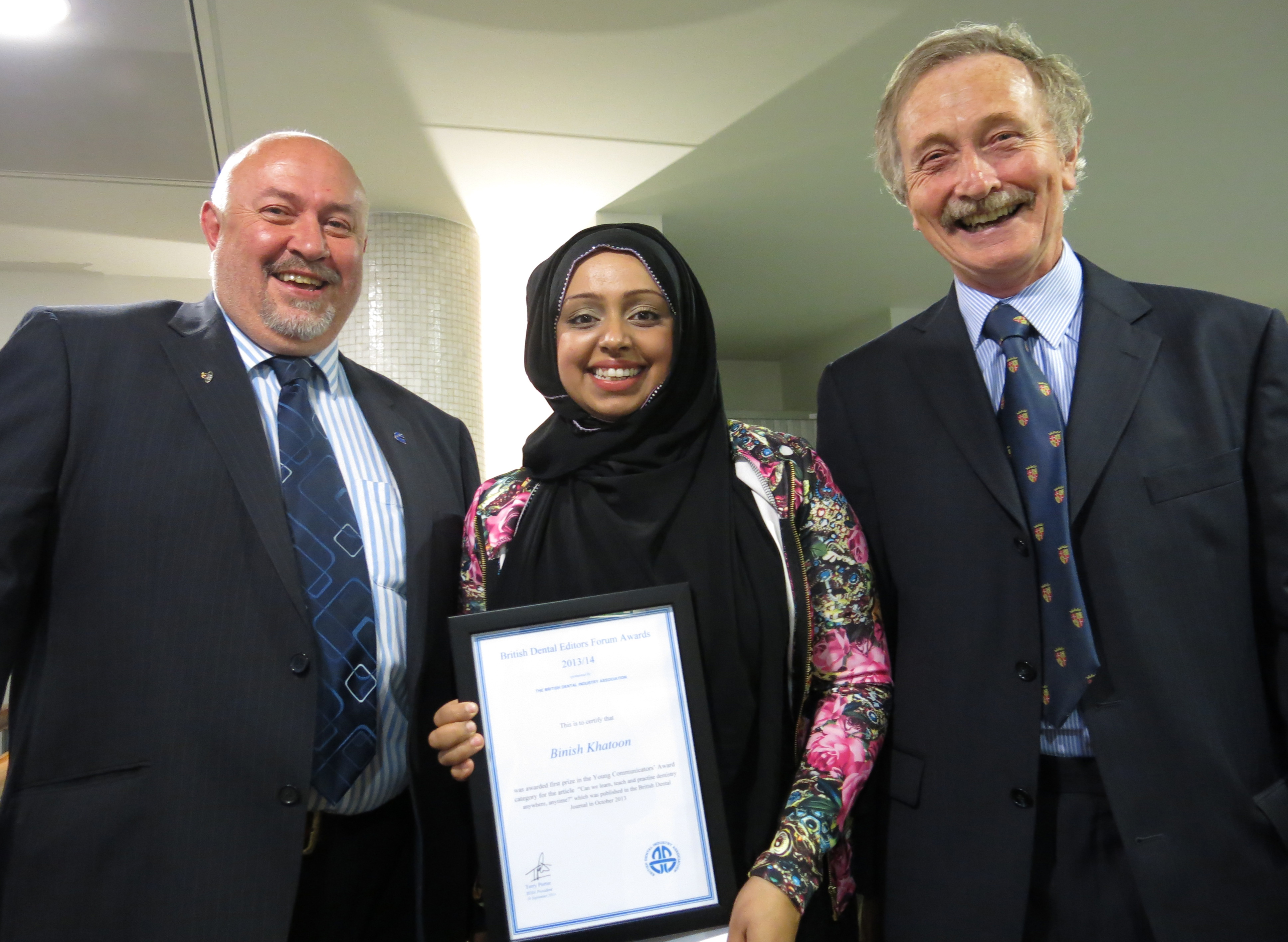 Binish Khatoon won the 2014 British Dental Editors Forum Young Dental Communicator Award. The award is given to a young person who has created a significant dental communication such as a refereed article, journalism, social media, video, podcast, or any other form of communication. Binish is a PhD student at the School of Dentistry undertaking educational research into mobile learning. Her article was successful in winning the award. Binish attended the award ceremony at the British Dental Association in Wimpole Street. On receiving her award from Dr Ken Eaton (BDEF) and Dr Mick Armstrong (Chair BDA PEC), Binish gave a thank you address to the assembled audience. Her article that won the competition is