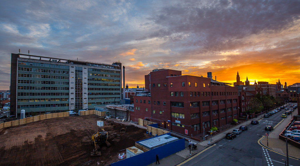 This sunrise shows the Dental School & Hospital together with the Children’s hospital looking down Whittall Street. With the demolition of the Hospital car park it is now possible to view the front face of the Dental School & Hospital.