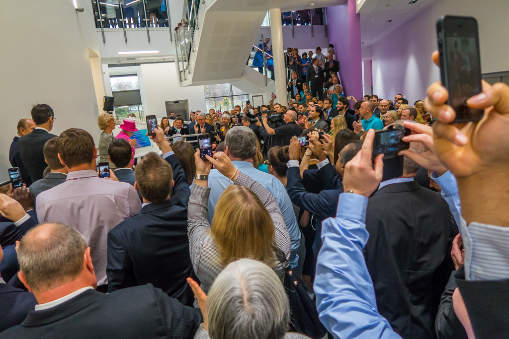An exciting day in the life of Birmingham Dental School and Hospital took place with the visit of the Queen and the Duke of Edinburgh. They were here to officially open our new Dental school and Hospital facility at Pebble Mill. The excitement reached fever pitch when it was known that it was to be a Royal Visit to the School and Hospital. This was the first visit of the Queen to Birmingham since 2012 and her itinerary included both the opening of the new Grand Central New Street station and an inspection of one of the new trams to be used on the streets of Birmingham. Once these two engagements were completed, it was the turn of the new School and Hospital to be visited. Many staff and students were up early to prepare the building for the visit. After moving through the various security checks, people went to their designated areas and waited patiently for the Queen’s Arrival. We were not disappointed by her presence and people were delighted to meet with her.