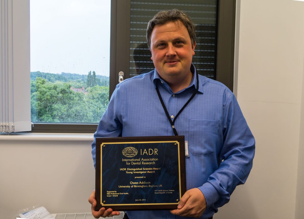 Many congratulations to Owen Addison on receiving the Young Investigator award in the Distinguished Scientist awards for 2016 . The award was presented to Owen at the International Association for Dental Research meeting which took place in Seoul, South Korea. There was a sizeable Birmingham contingent present at the meeting which showcases the latest developments in Oral and Dental research.