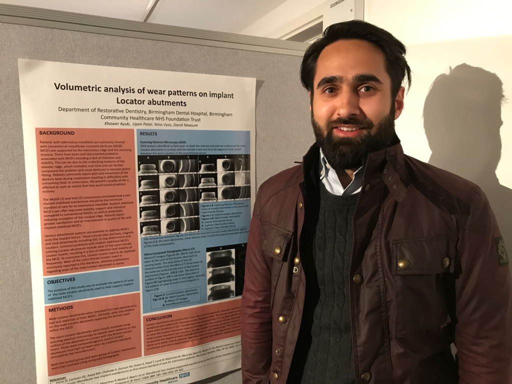 Mr Khawer Ayub won best poster in the Research category entitled ‘Volumetric analysis of wear patterns on implant Locator abutments’ with analysis from Dr Nina Vyas (Post-doctoral Researcher) and supervised by Dr Upen Patel (Specialty Registrar and Lecturer in Restorative Dentistry) and Mr David Newsum (Consultant in Restorative Dentistry).