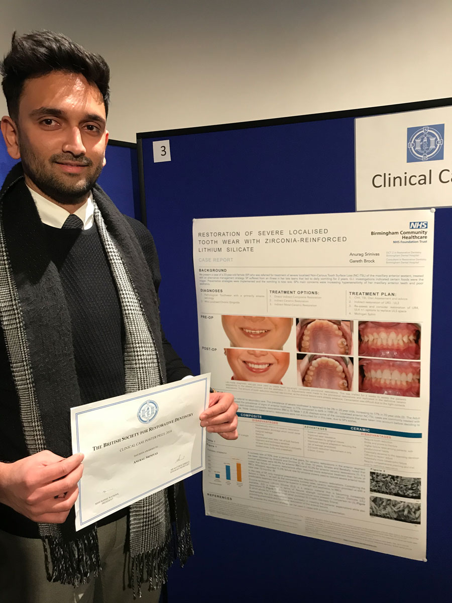 Mr Anurag Srinivas won best poster in the Clinical Case category entitled ‘Restoration of severe localised tooth wear with zirconia-reinforced lithium silicate’ supervised by Dr Gareth Brock (Consultant in Restorative Dentistry).