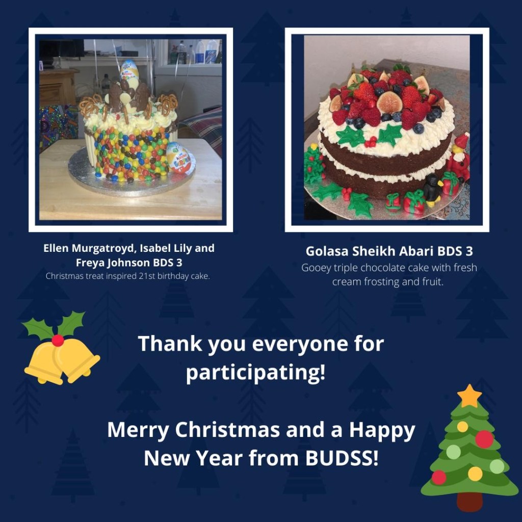 “The results for the BUDSS Christmas Bake-Off are in! Our judges Paul (Chapple) Hollywood and Mary (Hill) Berry have chosen two talented star bakers. Thank you so much to everyone who entered, we are so impressed by all of your amazing bakes”