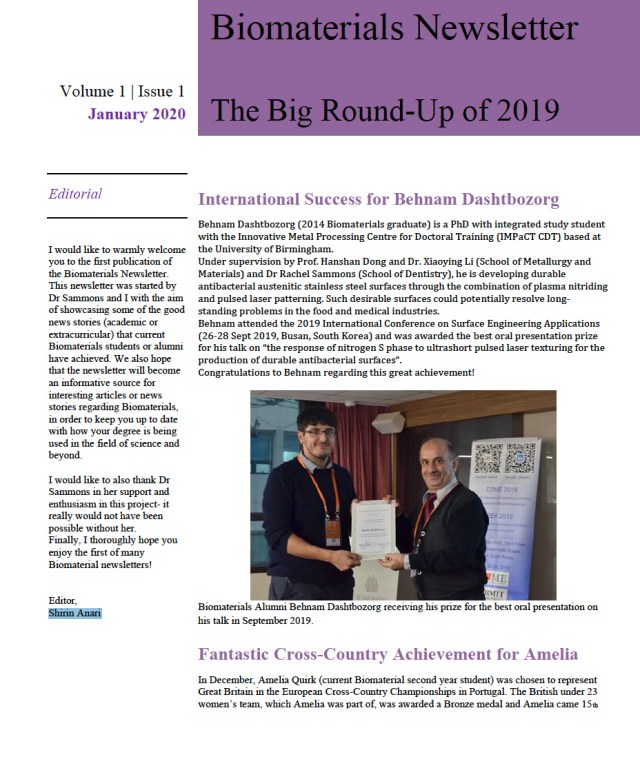There is a new newsletter being published by the Biomaterials Students and staff. The first issue is available for reading by clicking on the link below. Well done to the editor, Shirin Anari, Enjoy the […]